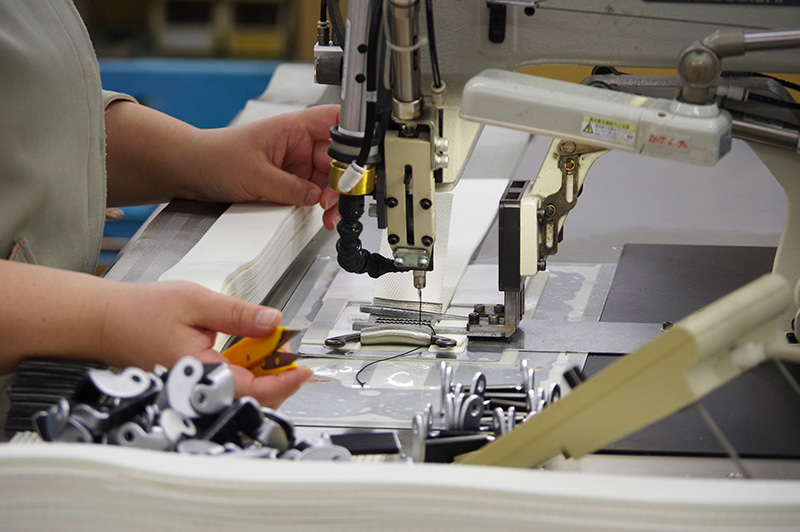 また生産設備の内製化に取り組み、染色から織りの製造部門と超音波による加工やコンピューターミシンによる縫製など様々な加工部門をすべて内製化して一貫生産システムを構築してまいりました。